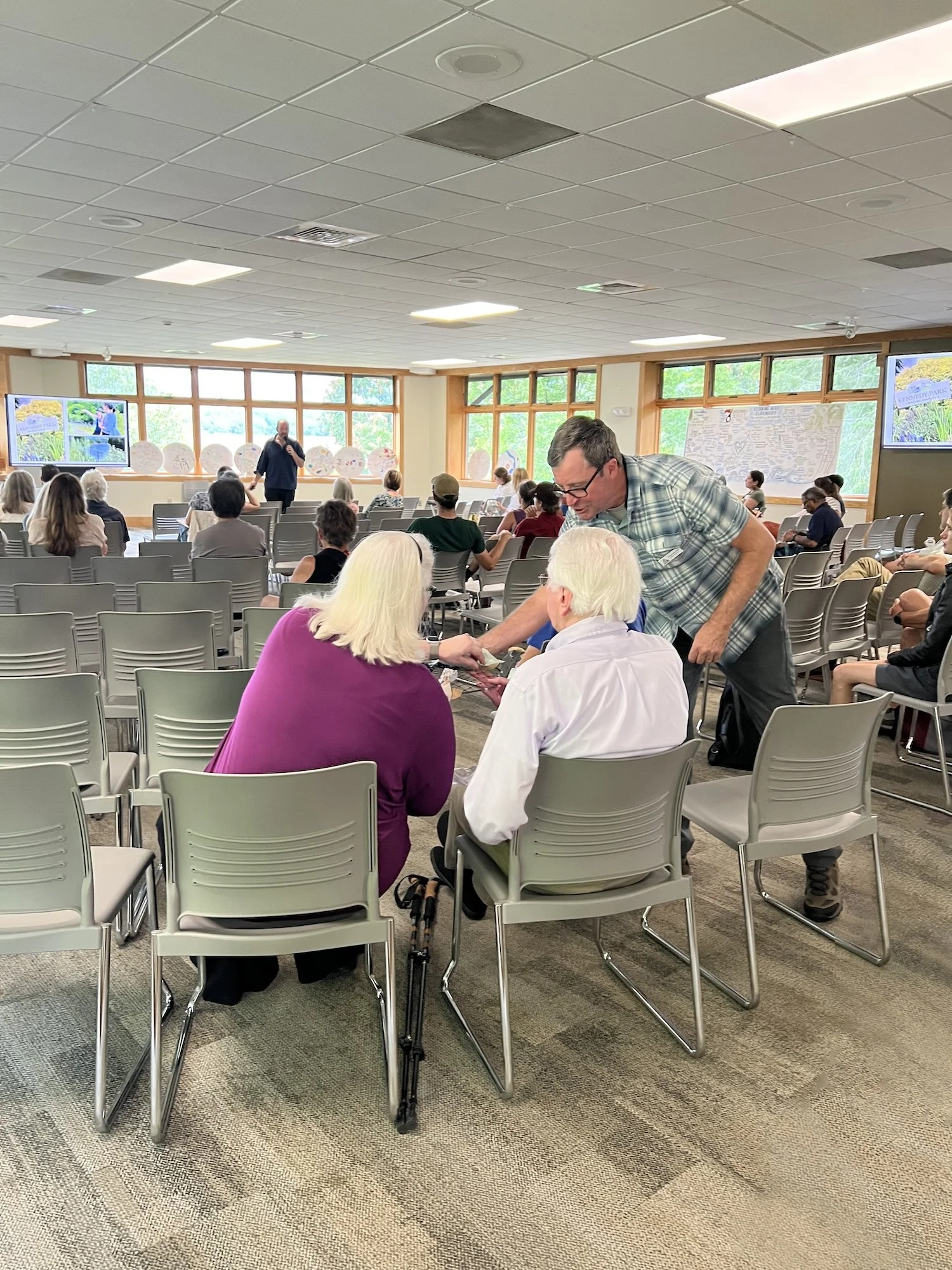 6/21/25 – Day 34: Emily presented a mobile activation during Summit: Collaboration for Climate Action at Warren Wilson College, inviting audience members to contribute fabric strips just before Ryan Smolar (holding the microphone at front of room, on behalf of Thrive Asheville) debuted the post-Helene research document, "Lessons for the Recovery."